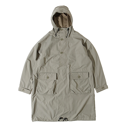 軽量でしなやかなエピックの一枚地ですので、雨天時のレインウェアとしても活躍します。やや大きめのシルエットですので、ニットやスウェットなどの上から羽織りとしても着用出来ます。立ち襟の中にフードを収納出来、裾のドローコードでサイズの調整が容易です。肘の部分は二枚地で補強されています。