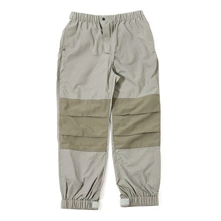 軽量でしなやかなエピックの一枚地ですので、雨天時のレインウェアとしも活躍します。やや大きめのシルエットですので、パンツの上から履くオーバーパンツとしても着用出来ます。裾のベルクロテープでサイズの調整が容易です。膝の部分は二枚地で補強されています。
