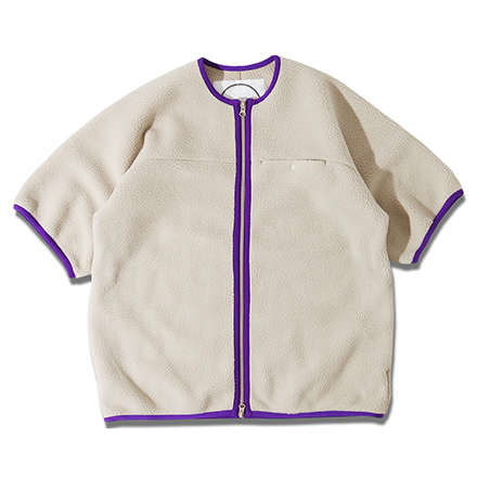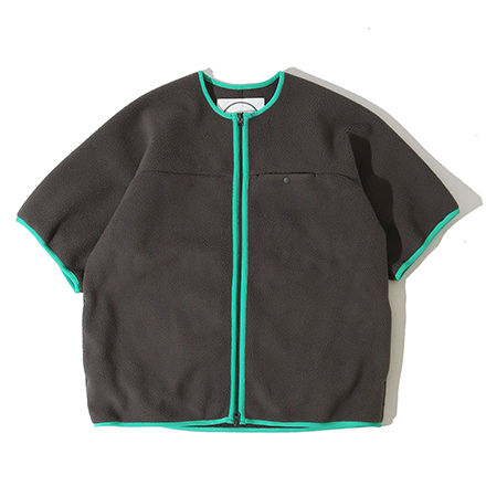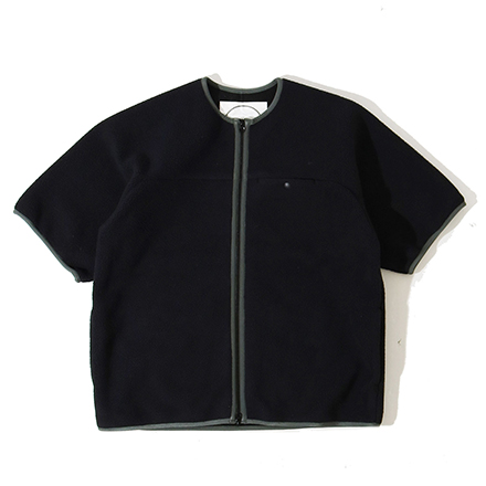 着脱のしやすいフルジップタイプ。レイヤードが楽しめるようあえて半袖にしています。ジップとネック、袖と裾を縁取るようにしたテーピングがデザインの特徴です。