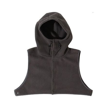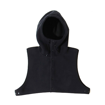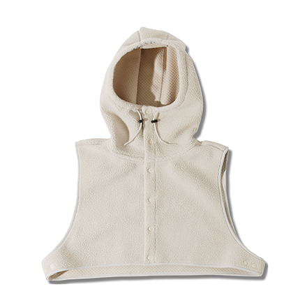 フードはなドローコードでフィッティング調整が可能です。左右の脇部分はドットボタンでアームホールの大きさの調整が段階的に行えますので、アウターの上に着たり、ジャケットの下に着たりとコーディネートに合わせて着方を楽しめます。全く新しいベストの登場です。