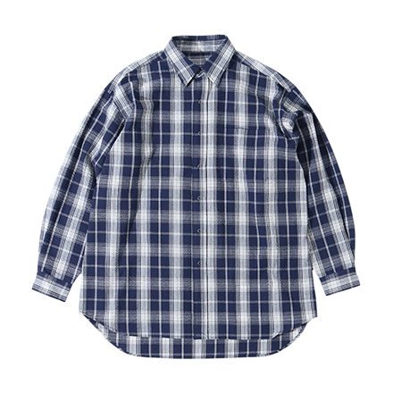 定番商品のボタンダウンシャツです。春夏シーズンにちょうどいいコットン55%、ポリエステル45%の肌触りのいい軽量なシアサッカー素材を使用しました。表面に波のような凹凸があるので、肌離れがよく通気性が高い為、着心地が良く重宝しそうです。プレイド柄のプリントが大人アメトラスタイルにどハマりしそうですね。